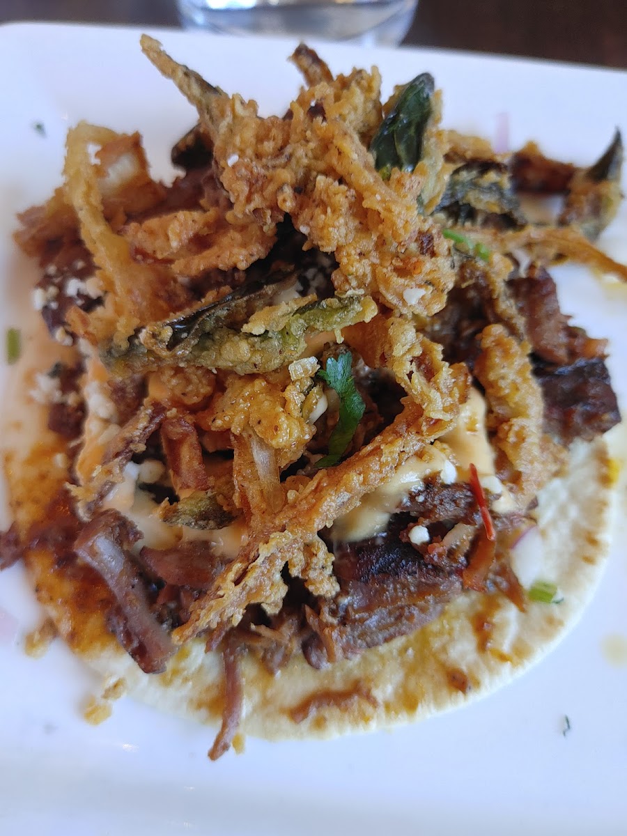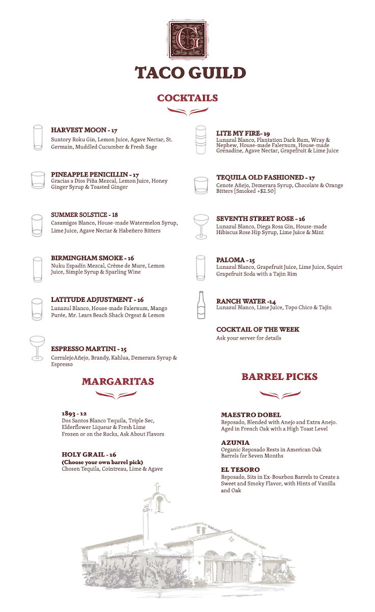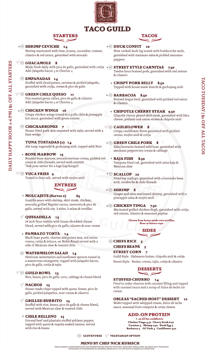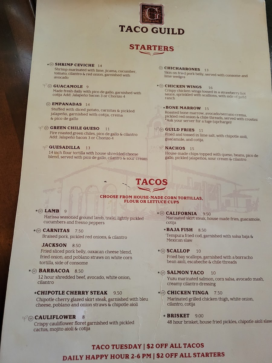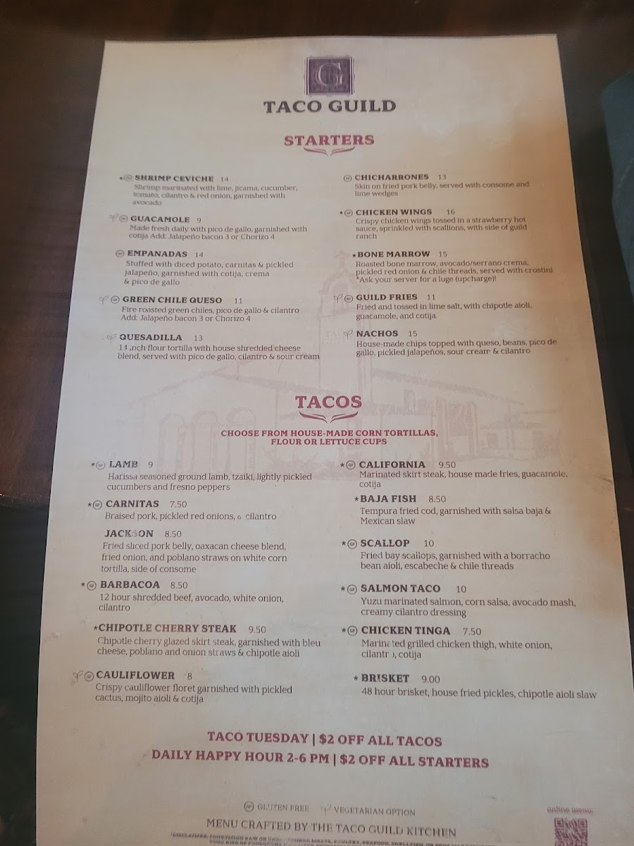 Taco Guild specializes in crafting an exciting array of tacos that balance traditional flavors with modern flair. Start your meal with their Lamb Taco, featuring harissa-seasoned ground lamb paired with a refreshing tzatziki sauce and lightly pickled cucumbers; it’s a tantalizing treat for the palate at just $9. For those craving something classic, the Carnitas Taco is an outstanding choice—braised pork topped with pickled red onions and cilantro for $7.50. If you’re in the mood for something richer, don’t miss the Jackson Fried Taco, which includes succulent fried pork belly, Oaxacan cheese blend, and crispy poblano straws for $8.50.